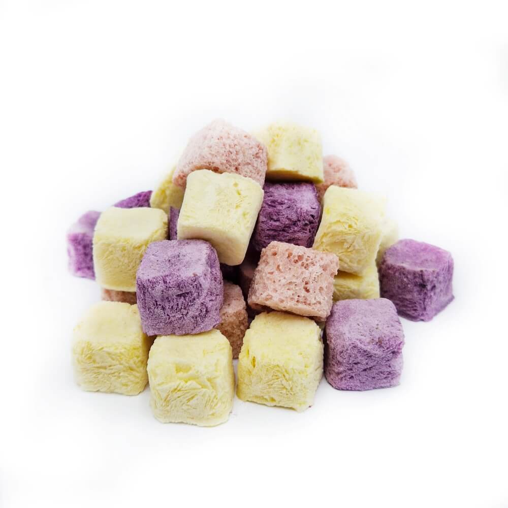 Objevte veselé čtverečky plné chuti! Coco Smoothie Mix je svěží směs mrazem sušeného ovoce a jemného kokosového mléka – a nic navíc. V jednom sáčku najdete tři druhy ovocných čtverečků – jahodové, borůvkové a broskvové. V puse nejprve kousky jemně křupnou a pak se rozplynou na jazyku jako nadýchaný obláček.