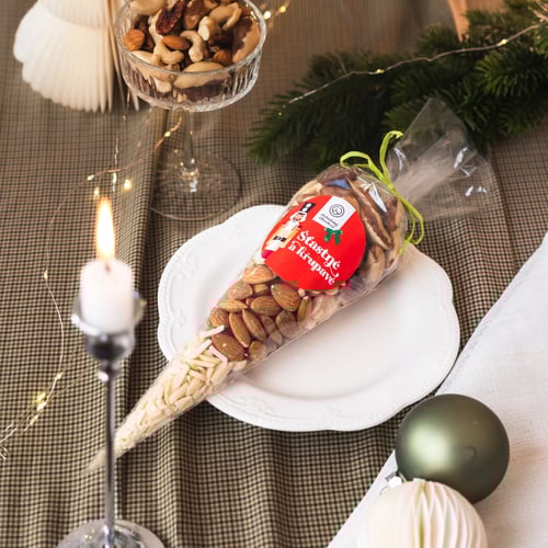 Popřejte svým nejbližším Šťastné a křupavé! Vyrobili jsme pro vás dárkový kornout plný nejoblíbenějších naturálních oříšků. Najdete zde: jádra naturálních mandlí a kešu oříšků, mandle loupané nasekané na hranolky a v neposlední řadě i pekany a para ořechy. Jedná se o limitovanou edici dárkových kornoutů. Stihli jsme pro vás vyrobit pouze 500 ks.  Kvůli vytíženosti výroby bude tato speciální edice dostupná pouze do vyprodání zásob.