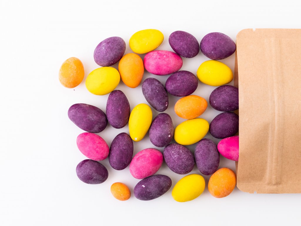 Mandle po francouzsku ? To je mandle v mléčné čokoládě obalené v křupavé krustičce s příchutí citronu, pomeranče a borůvky.
