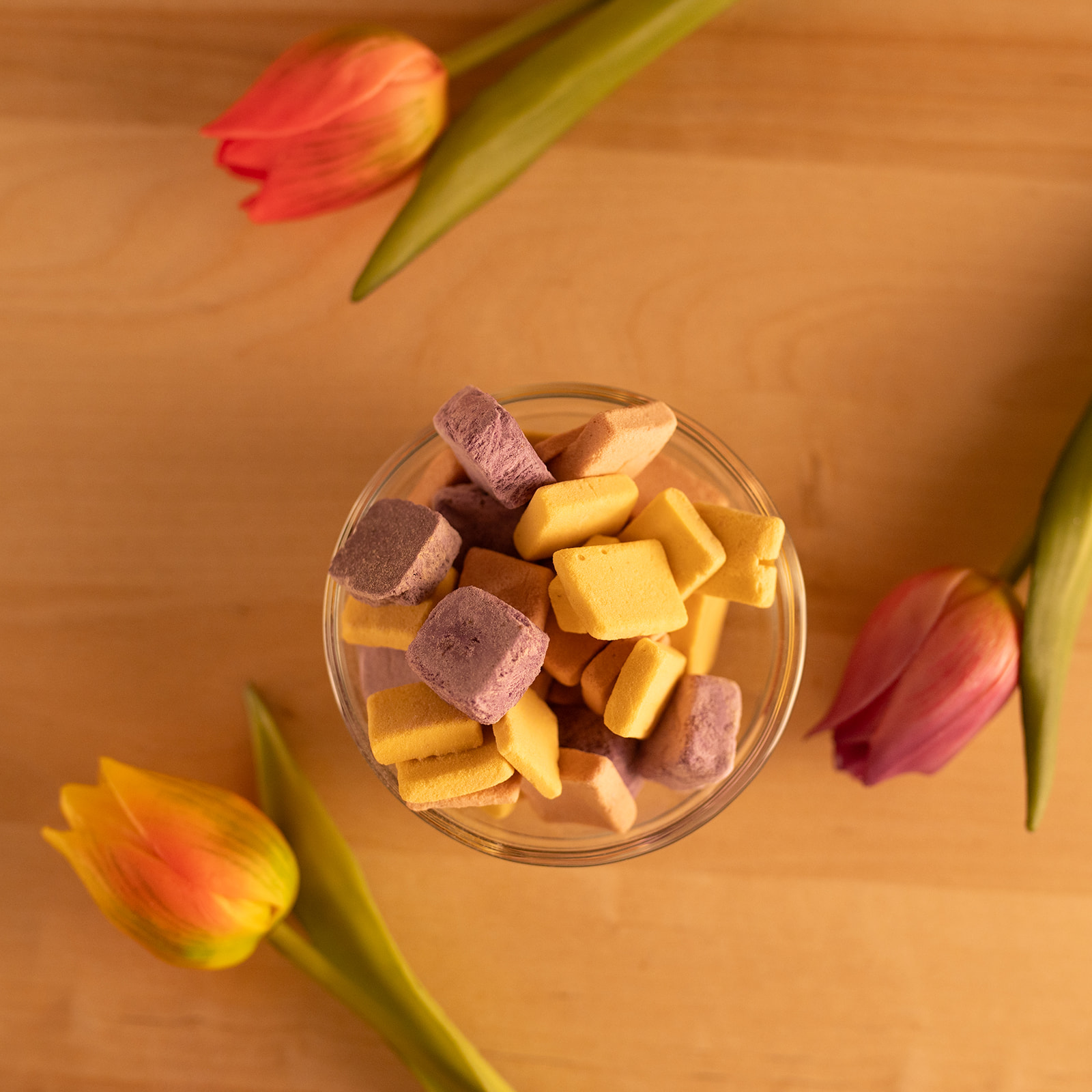 Tyhle ovocné polštářky jsme vytvořili jako hravou, zdravou alternativu sladkostí. Žádná chemie, žádné přidané cukry — jen čisté ovoce usušené mrazem, které si uchovává krásnou barvu, vůni a plnou chuť.