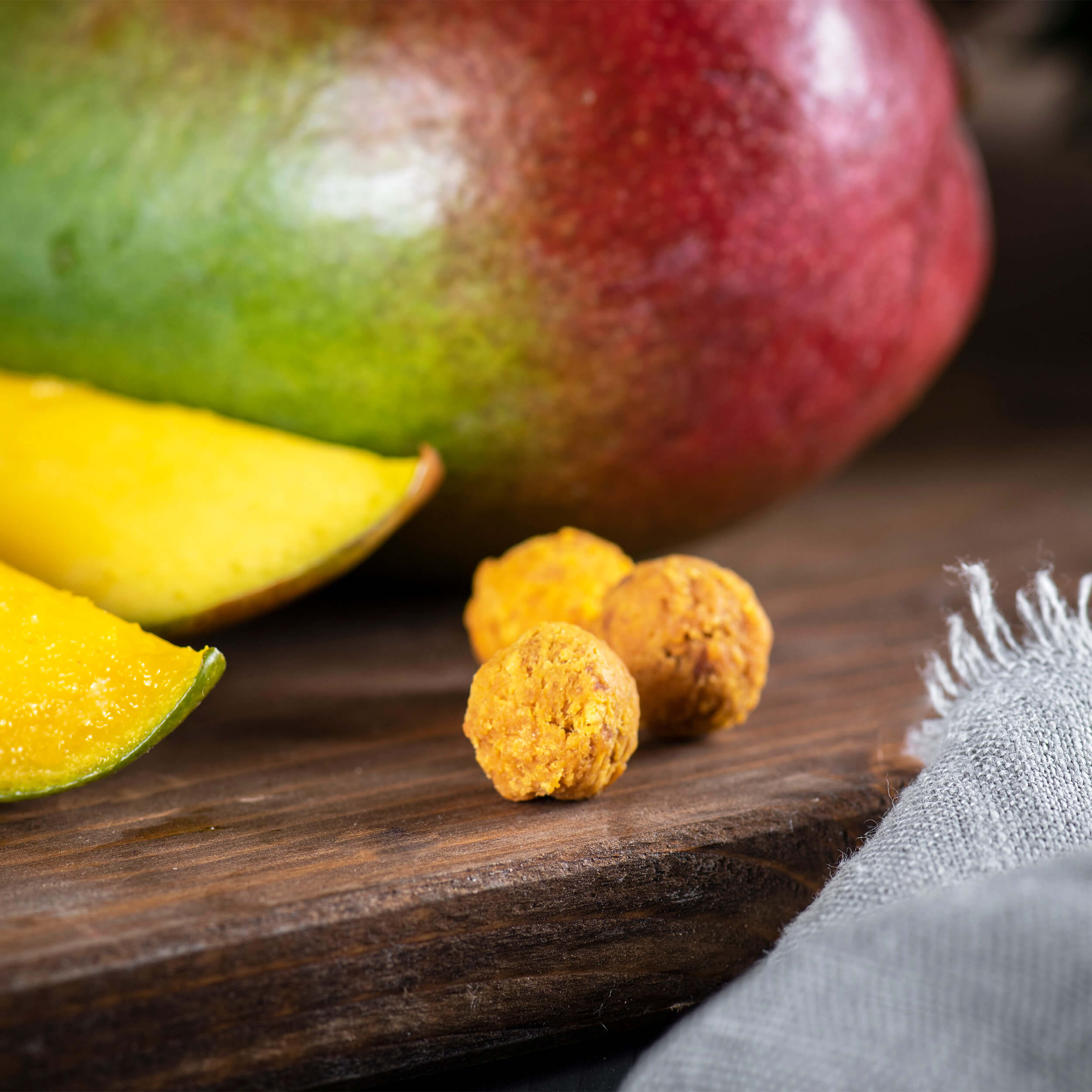 Při výrobě saháme pouze po plně vyzrálých plodech, které díky africkému slunci vynikají výraznou chutí, vůní a vysokým obsahem přírodního cukru. Mangu dodá jemně medový tón, zatímco ananas kuličkám propůjčí výraznou ovocnou svěžest. Dohromady tvoří lahodný mix, který si zamilujete na první ochutnání.