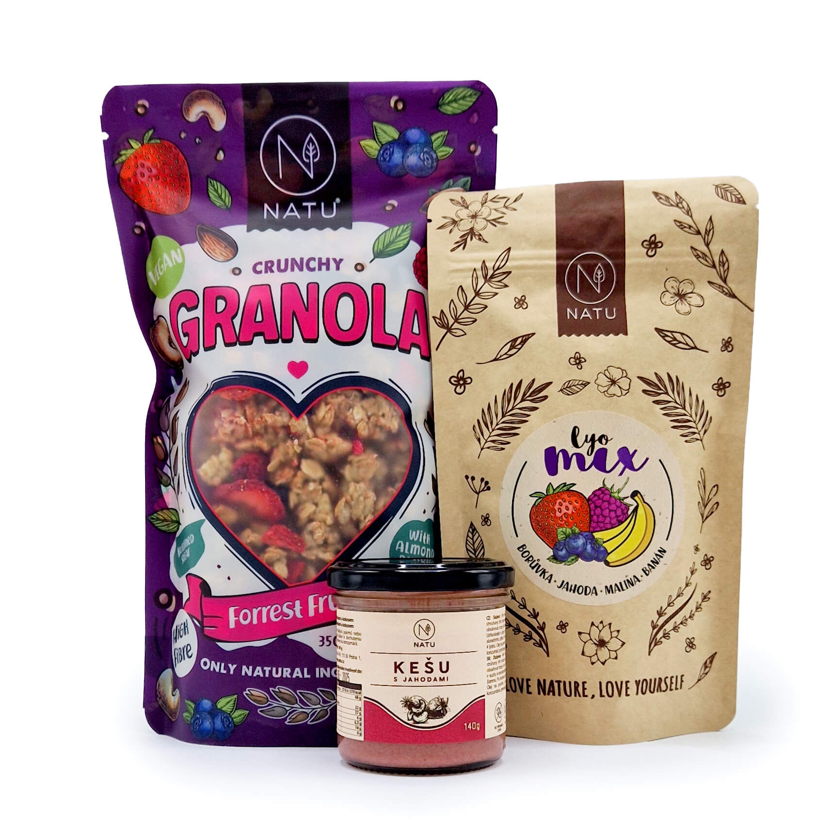 Jahody, maliny, borůvky... Mrazem sušené ovoce chutná jako čerstvě utržené, je nabité vitamíny a úžasně voní. Najdete ho v naší nejovocnější Granole lesní plody, křupavých lyo mixech i v oblíbených oříškových krémech. Sada plná ovoce je stvořená pro přípravu výživné snídaně nebo svačiny. K najemno mletému kešu krému jsme přimíchali nadrcené mrazem sušené jahody a trochu kokosu. Tahle voňavá delikatesa povýší každou snídani na nevšední zážitek. Zkuste přidat pár lžiček do granoly a zažijte explozi chutí.