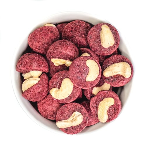 Drobný kopeček s velkou chutí! Jemné kešu obalené v křupavé borůvkové krustě vypadají jako miniaturní zmrzlina, která se ale nerozteče. Slibujeme vám, že ovocná svěžest borůvek a máslová chuť kešu tvoří opravdu dokonalou dvojku. Bez přidaného cukru, plný chuti – prostě svačinka, která potěší všechny vaše smysly!