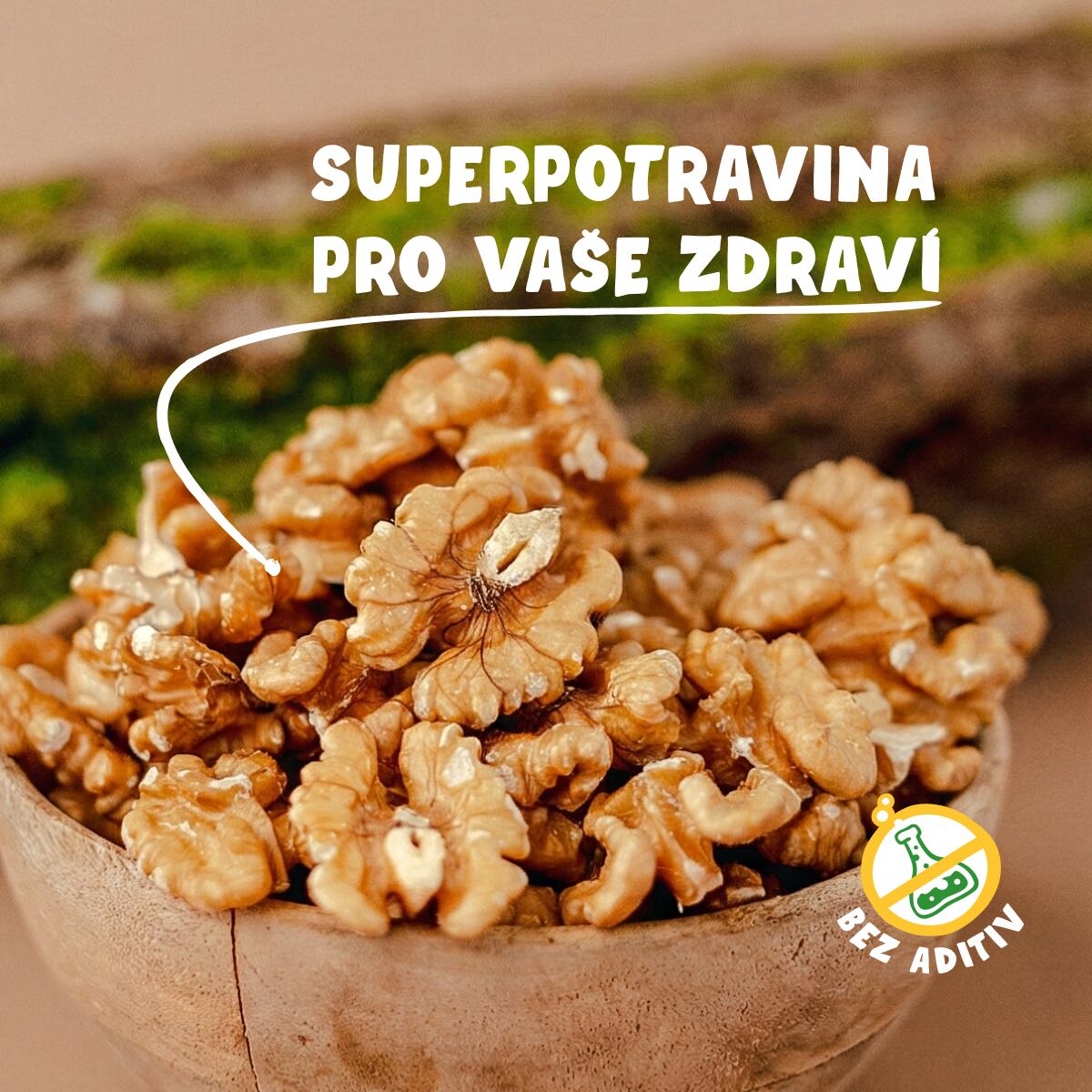 Vlašské ořechy 90% půlky JumboInformace o produktuVlašské ořechy jsme vám přivezli až z Chile. Balení obsahuje až 90 % půlek, což znamená, že v něm najdete zcela minimum zlomků. Na každém dezertu tak budou krásně vynikat – ať už samostatně, či v kombinaci s dalšími přírodními ořechy. Od našich vlašských oříšků můžete očekávat jediné, a to jemnou vláčnou chuť a máslovou texturu. Tyto JUMBO kousky vás překvapí hlavně svou velikostí. Navíc už je nikdy nemusíte louskat, to jsme udělali za vás!TOP informace o vlašských ořešíchVíce než 60 % vlašského ořechu tvoří neobyčejně zdravé tuky.Vlašský ořech je v podstatě pecka.Pro své léčebné účinky se používají také listy ořešáku.Vlašský oříšek jak mozek vypadá a zároveň funkci mozku podporuje.Pochází ze Střední Asie a během středověku doputoval až k nám.Jak se vlašský ořech pěstuje?Vlašské ořechy rostou na ořešáku a z botanického hlediska jsou to vlastně pecky. Ořešák královský může v některých případech dorůst až do výšky 45 metrů. Tento strom, který lidé pěstují převážně pro vlašské ořechy, ale má i širší využití. Vrhá stín, jeho listy ničí bakterie a pomáhají i lidskému zdraví. Samotný oříšek je schovaný ve dvou vrstvách. Na povrchu má zelený obal, pod ním se nachází tvrdá skořápka. Jakmile plod dozraje, vypadne ze zeleného pouzdra a dopadne ve skořápce na zem.